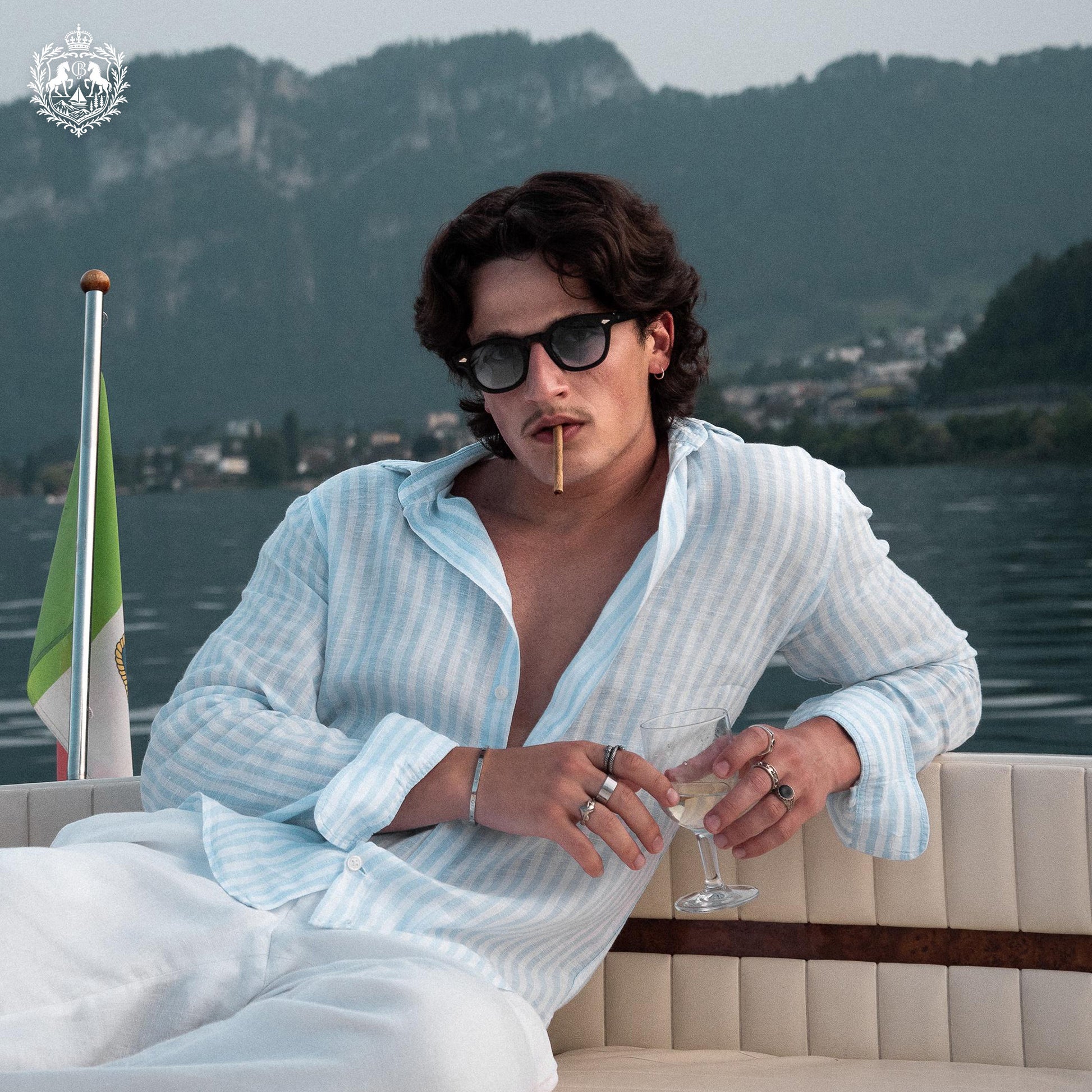 Still waters, deep elegance — Como captures the quiet sophistication of lakeside evenings. Its classic black frame paired with cool blue gradient lenses mirrors the calm of sky meeting water, a reflection of timeless style and unspoken confidence.